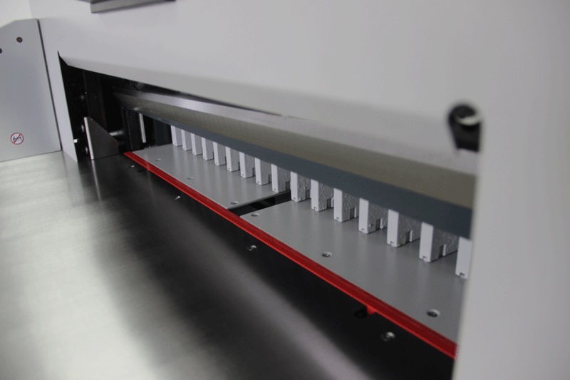 Оснащен удобным и простым в эксплуатации программируемым сенсорным 7″ LCD дисплей, показывает местоположение затла (заднего упора для листов) с высокой точностью, благодаря чему можно проверить подобранные размеры.У резака есть цифровая программируемая корректировка положения затла по отношению к ножу. Он оснащен удобным и простым в эксплуатации программируемым пультом управления, шаг позиционирования 0.1 мм и позволяющим управлять перемещением затла в автоматическом режиме.