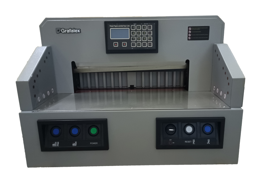 Установленный в нем LCD дисплей с высокой точностью показывает местоположение затла (заднего упора для листов), благодаря чему можно проверить подобранные размеры. На пульте управления резака Grafalex 4808H имеется цифровая клавиатура для ввода параметров (координат) реза.Резак обладает высокой точностью работы механизма управления бумагой. Использование червячного редуктора с плавным перемещением и низким уровнем шума, а также стабильно и надежно работает при интенсивных нагрузках. Высокотехнологичная интегральная схема цифрового управления позволяет обеспечить высокоэффективную работу устройства.