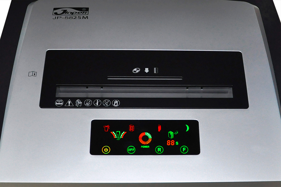 Шредер JP-5825M подходит для уничтожения секретных документов с фрагментом реза 2×15 мм и относится к профессиональной серии, к уничтожителям для больших рабочих групп пользователей. Уничтожает кредитные карты, диски DVD/CD, степлерные скобы.Уничтожитель оснащен современной полноцветной сенсорной панелью управления с большим количеством индикаторов, упрощающих работу. Через 60 секунд простоя уничтожитель автоматически переходит в режим сохранения энергии.